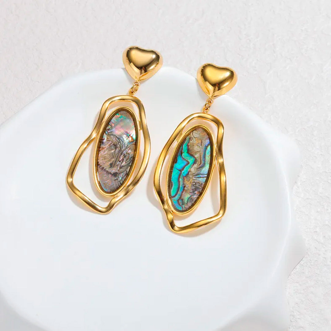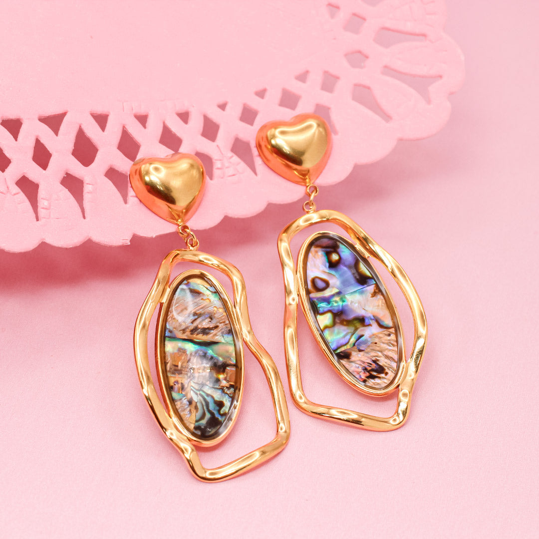 Estos aretes destacan por su delicado corazón y su colgante curvo con efecto iridiscente, son una pieza que elevará cualquier atuendo y le dará un toque único.