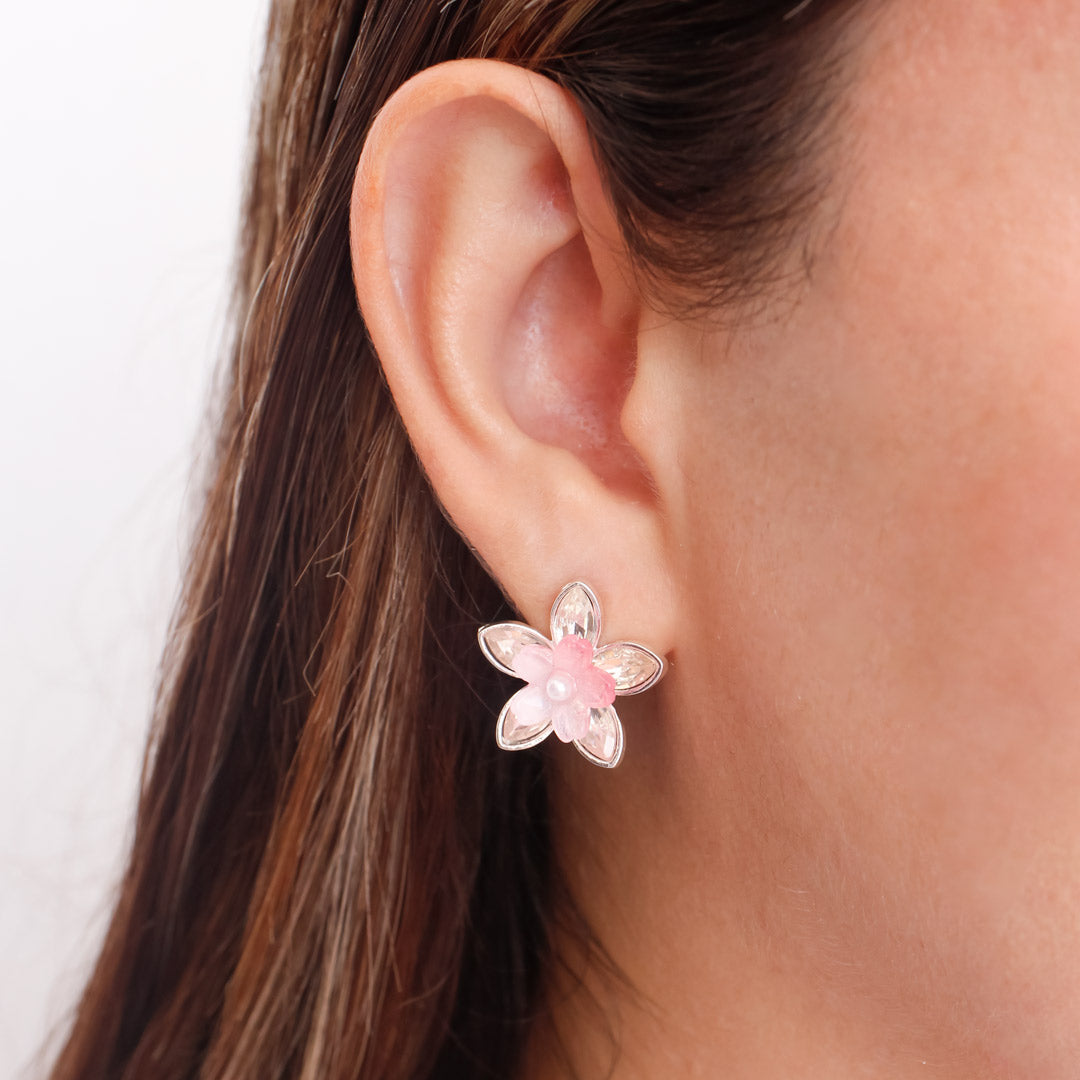 Amarás estos aretes con diseño floral  y centro perlado que aportan un brillo sutil y elegante. Ideales para complementar tanto looks románticos como outfits sofisticados.