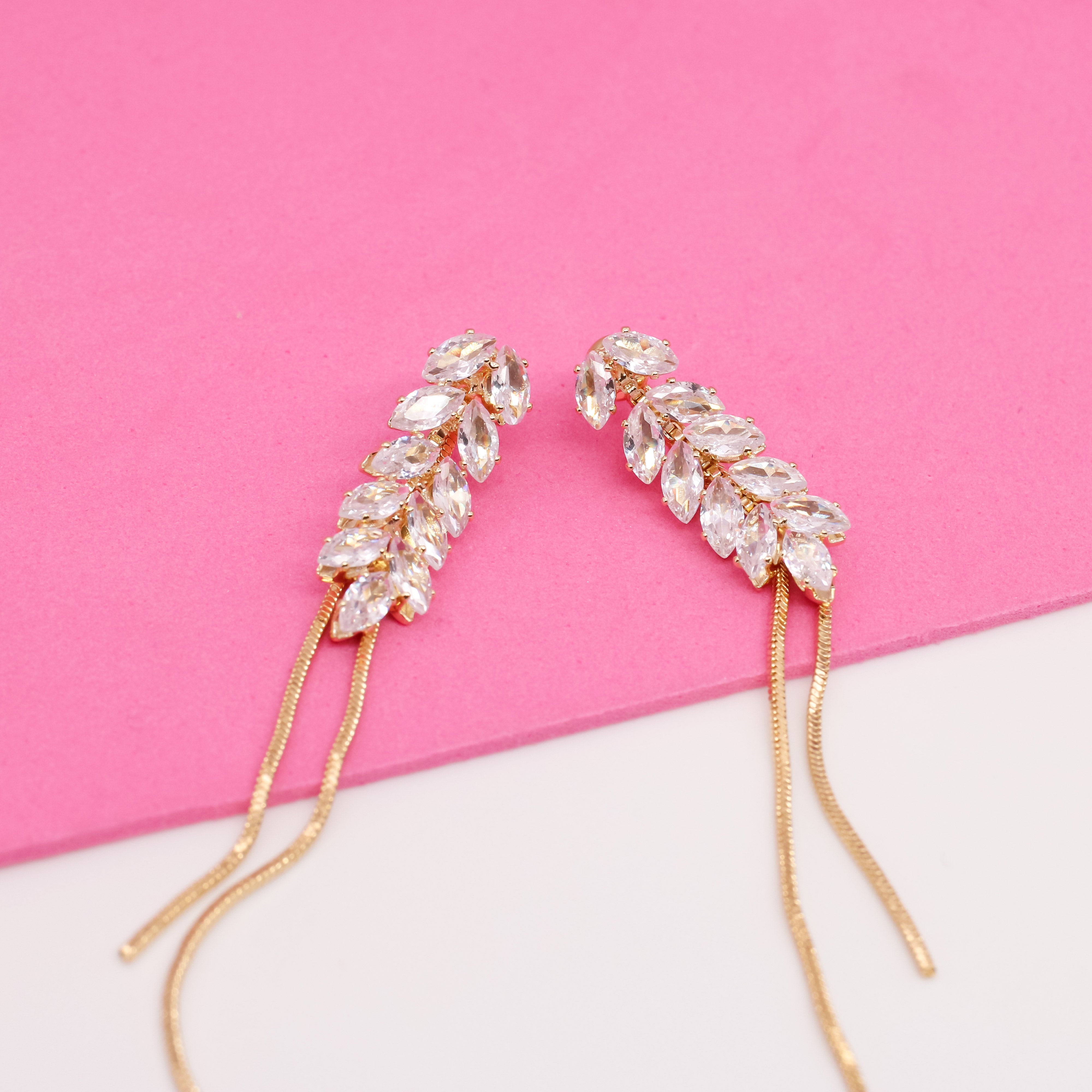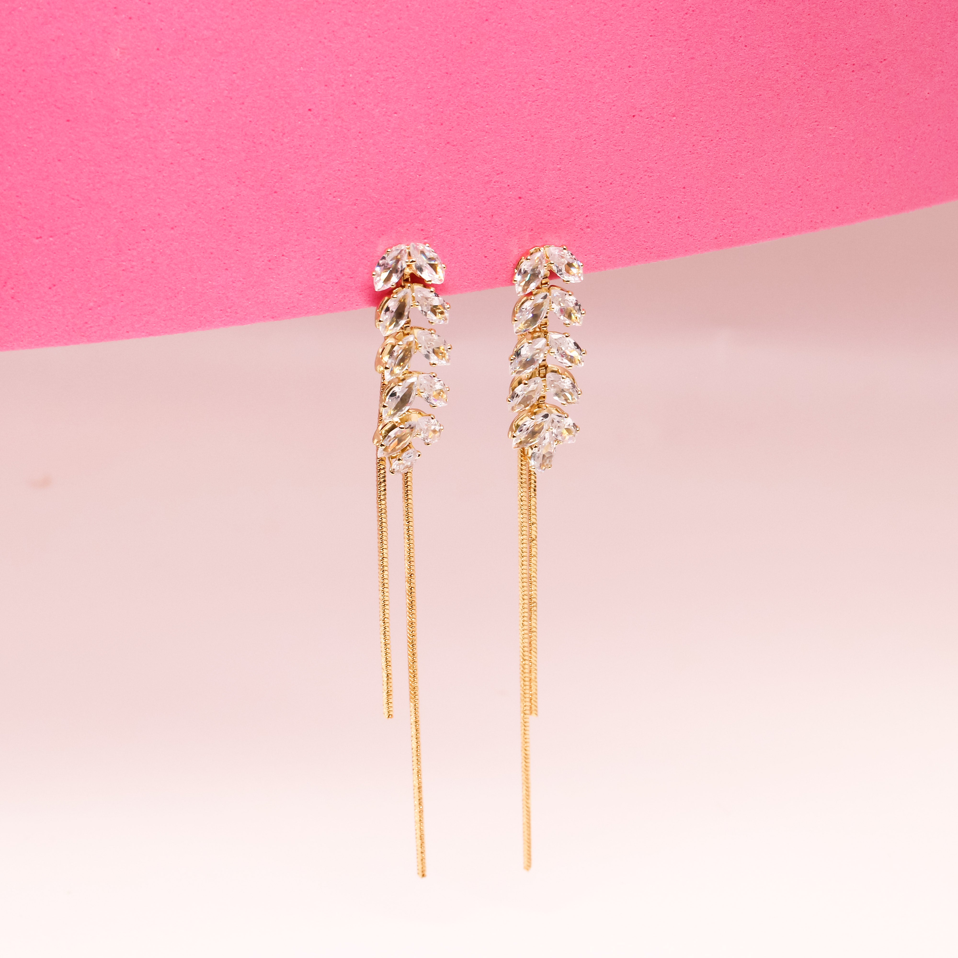 Estos aretes destacan por su diseño alargado con detalles de zirconia en forma de hojita. Son ligeros, femeninos y perfectos para estilizar el rostro y añadir un toque glamuroso a cualquier ocasión.