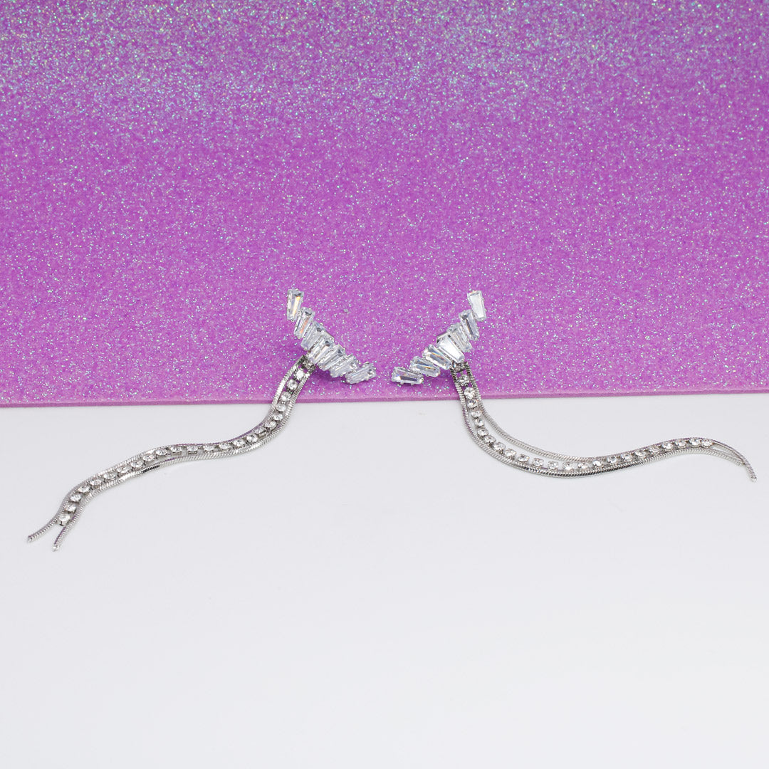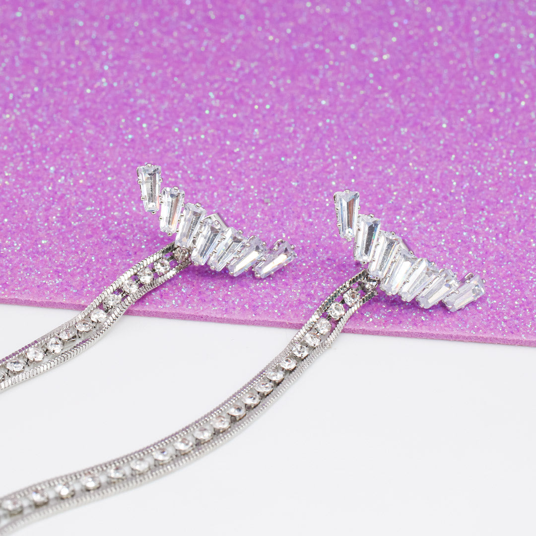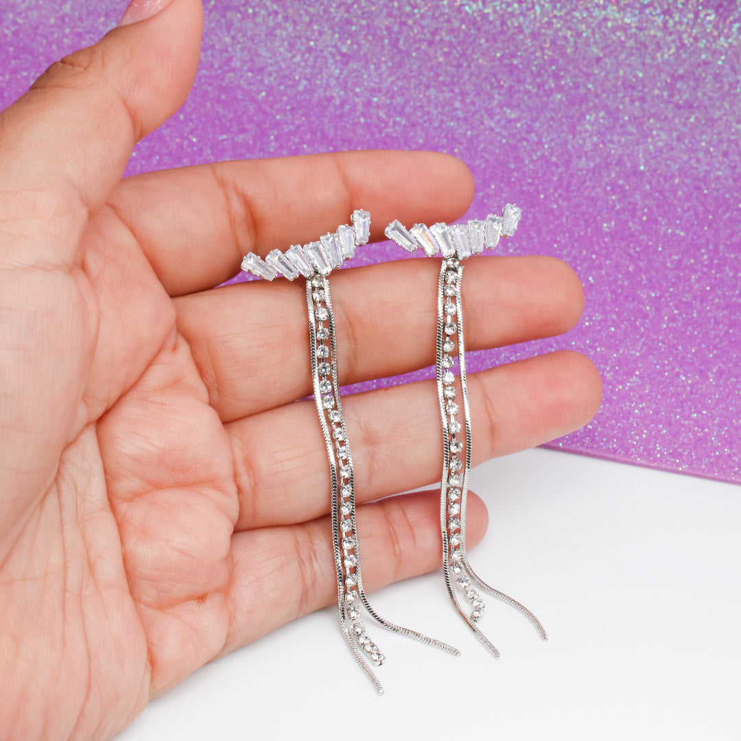 Un aretito que abraza la oreja y una caída larga que estiliza el rostro. Perfectos para eventos de noche, fiestas o simplemente para robar miradas.