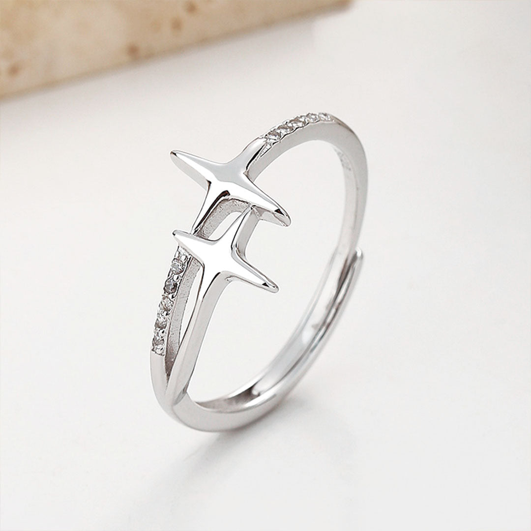 Este anillo abraza tu dedo con un diseño ajustable en forma de estrellas con zirconias, amarás su delicadeza, ajústalo a tu medida.