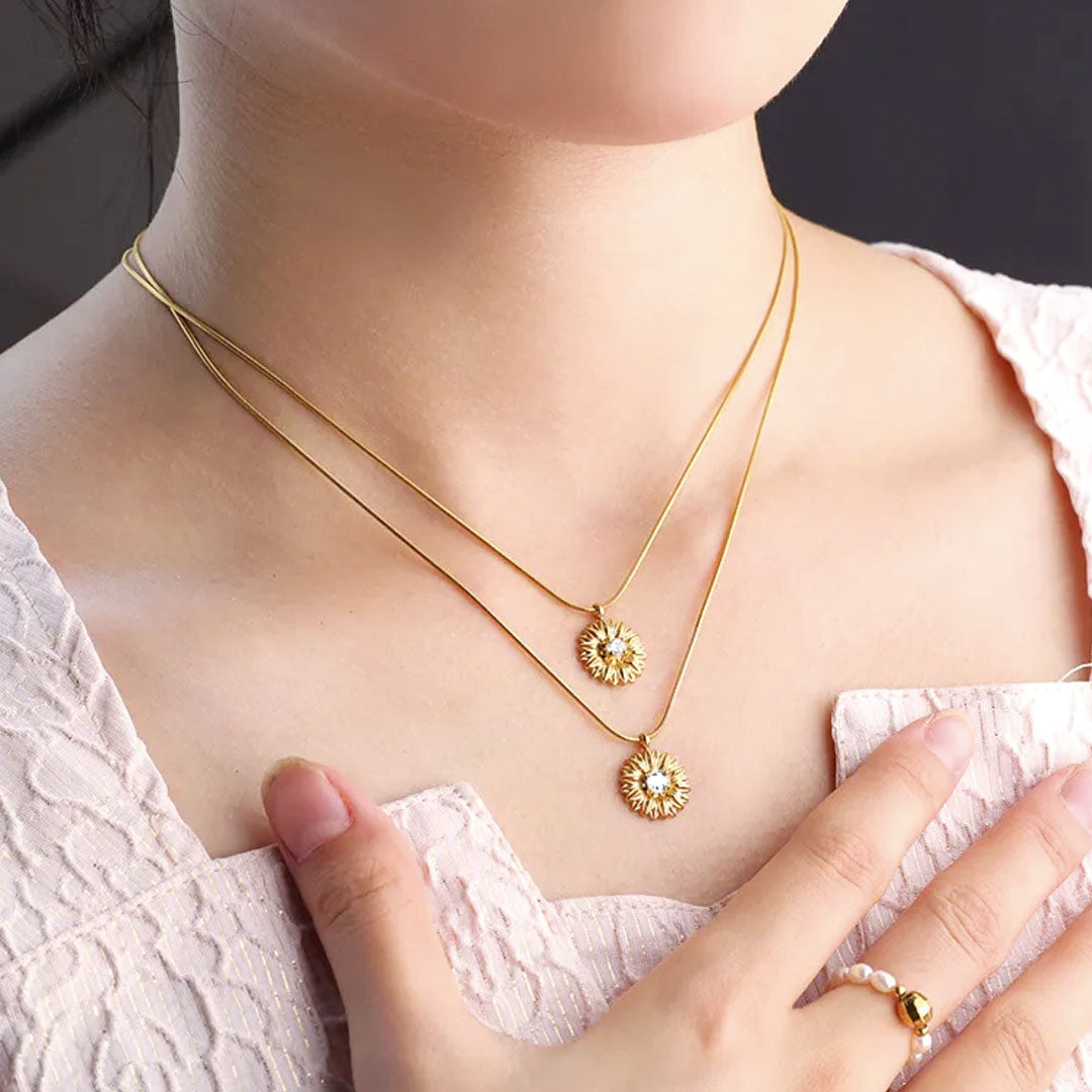Este collar con dije de girasol es una pieza que simboliza alegría, luz y amor. El toque perfecto para iluminar tu día.
