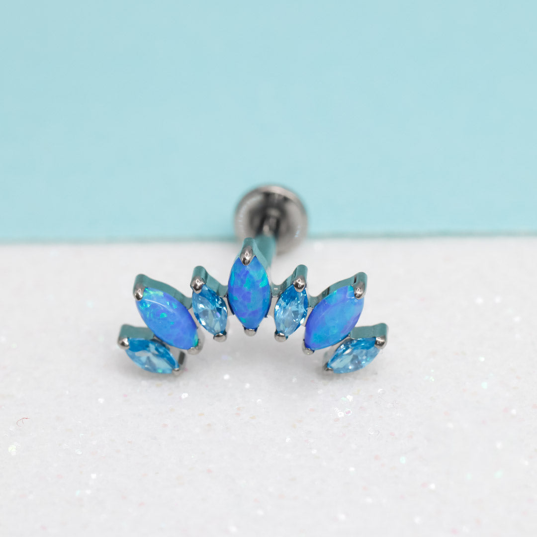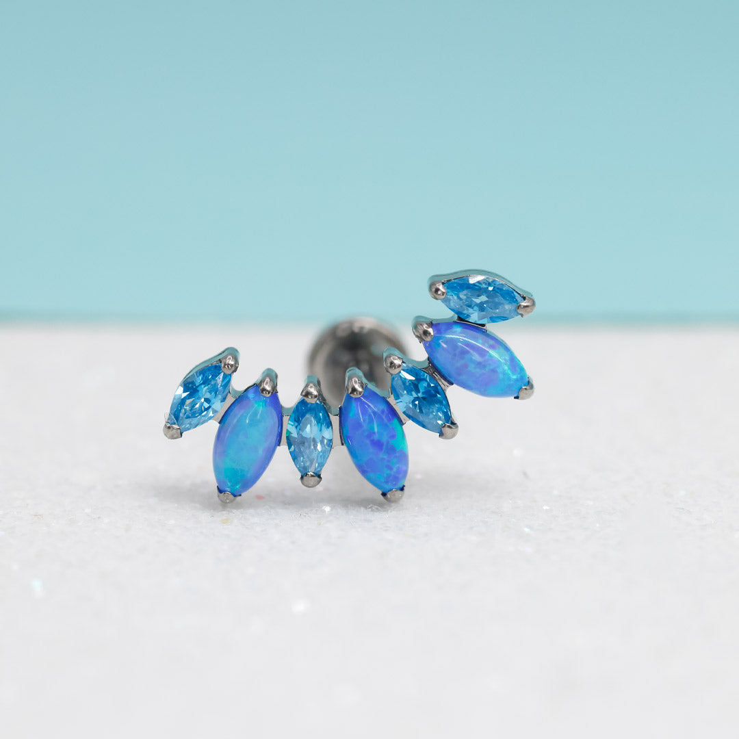 Detalle en incrustación de Ópalo azul y zirconias azules