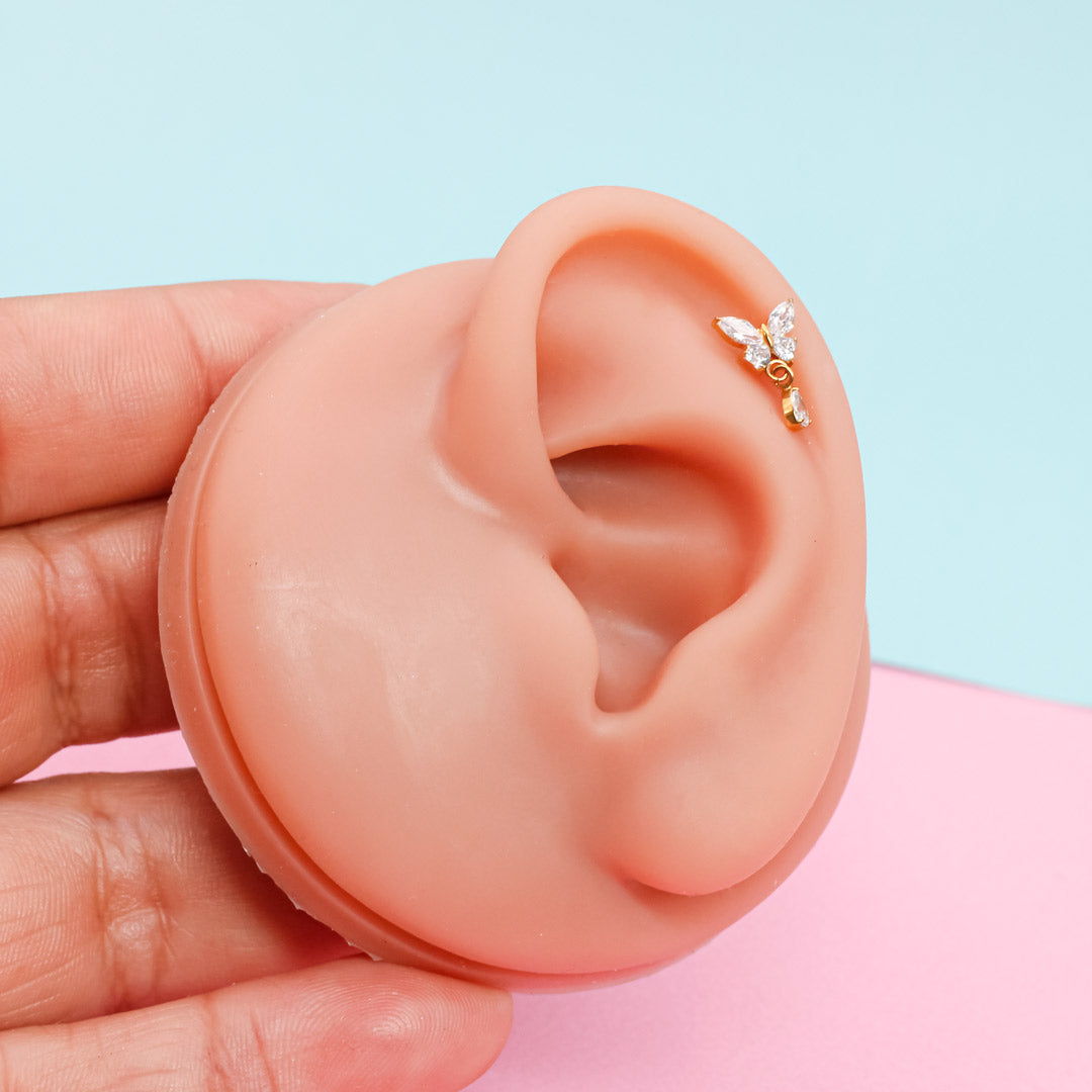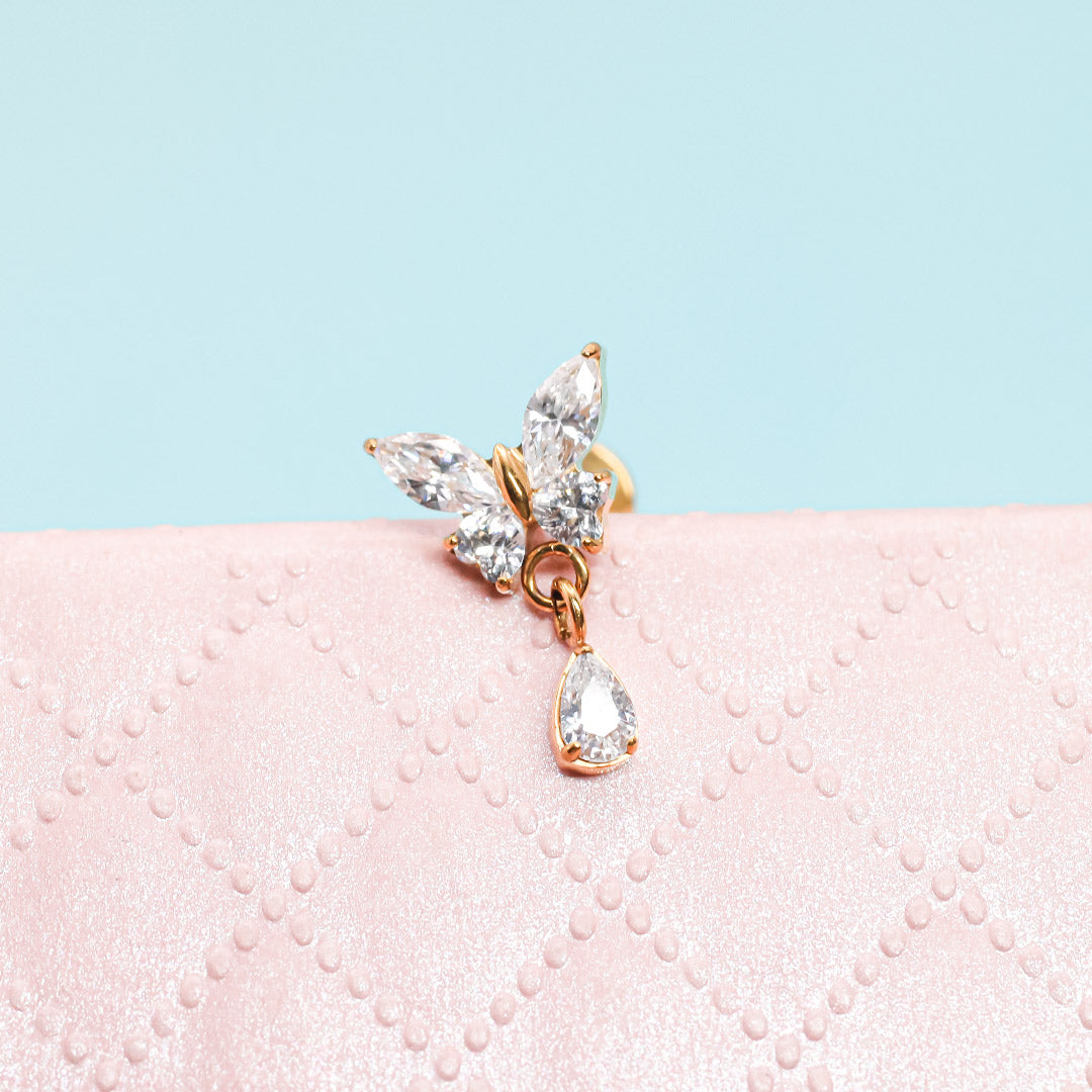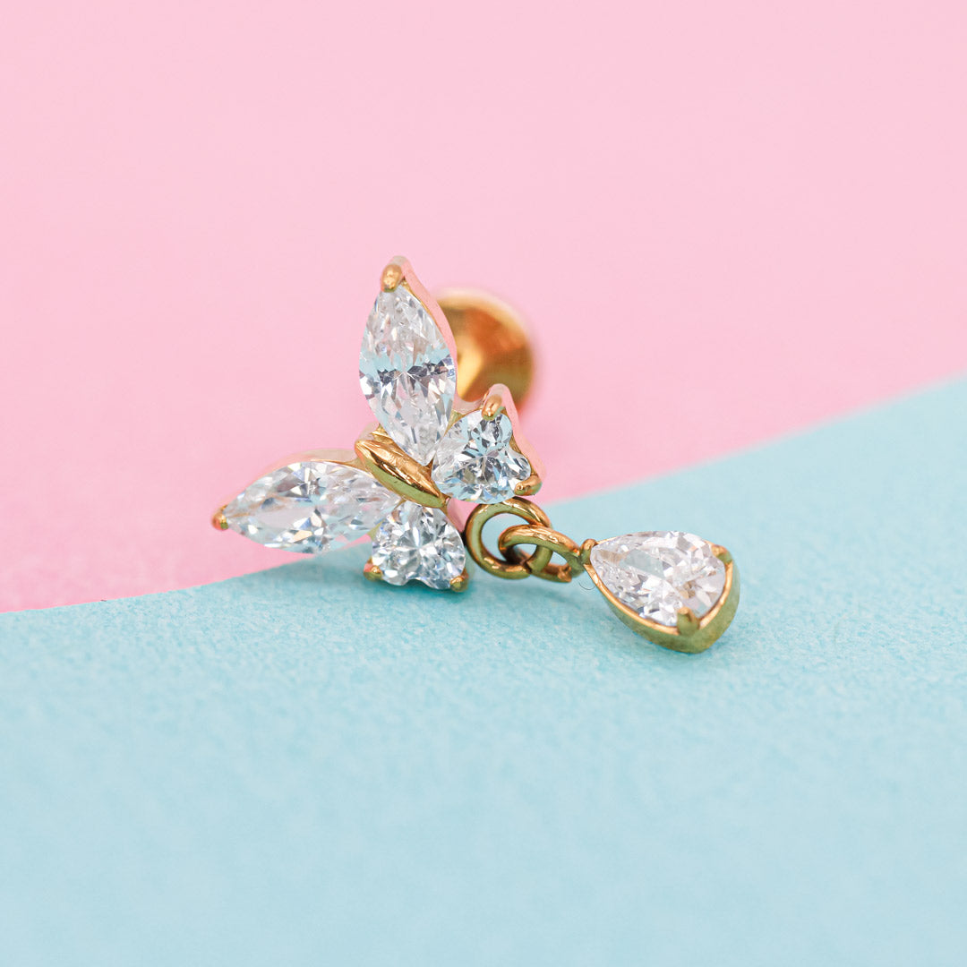 Este piercing con estilo mariposa y un colgante en forma de gota es ideal para darle un toque delicado y femenino a tu look. Fabricado en titanio grado implante, es hipoalergénico, duradero y cómodo para uso diario.