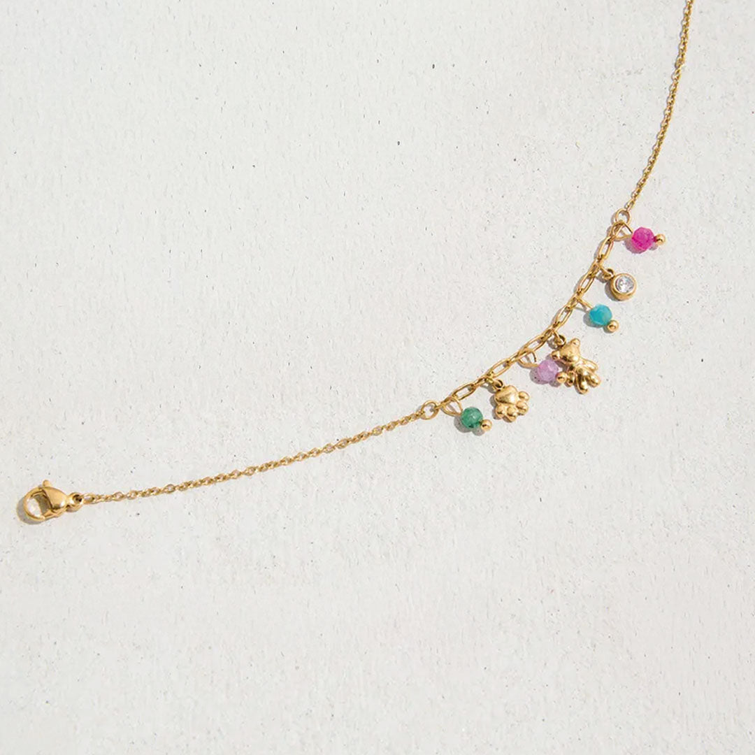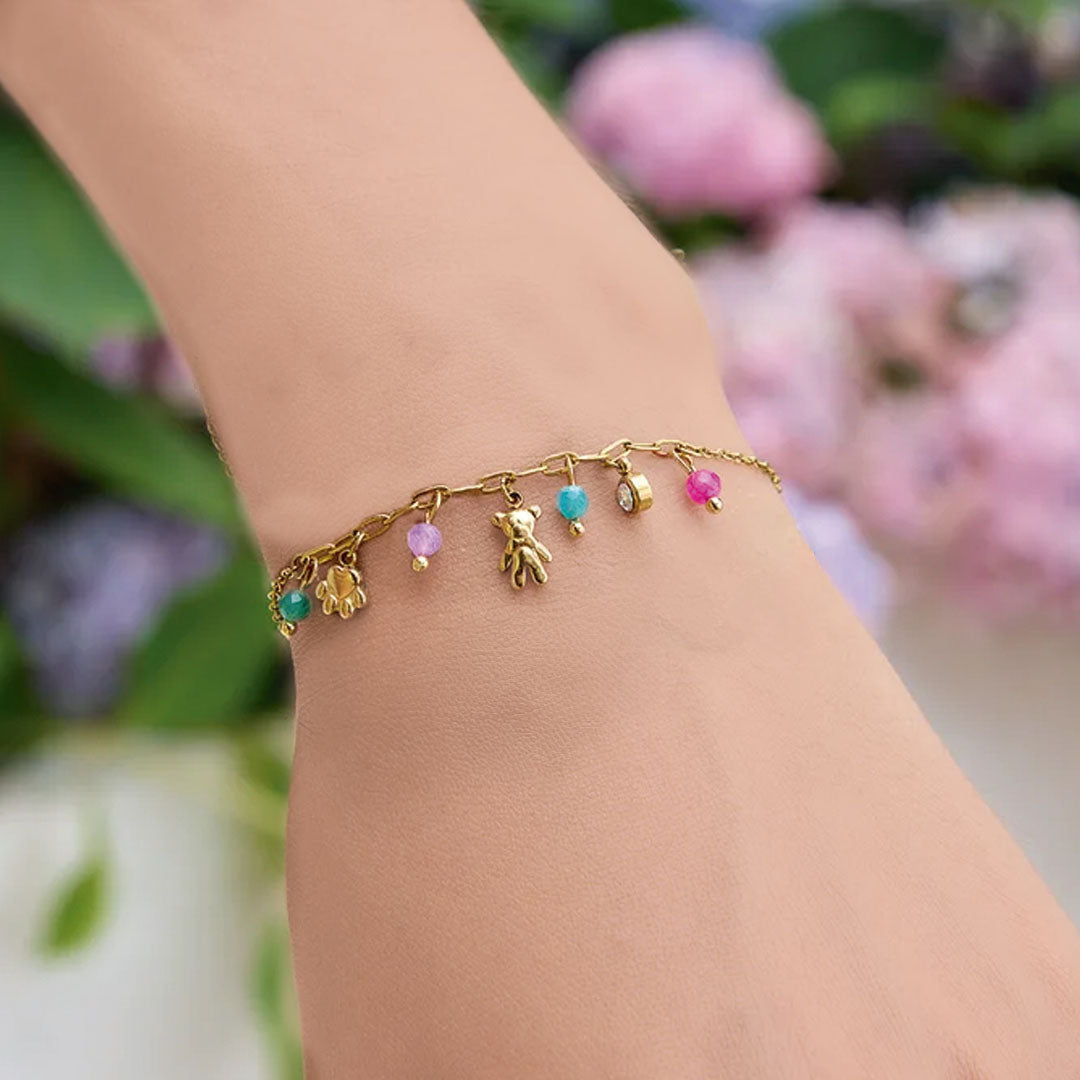 Los colgantes de esta pulsera te encantarán, tienen detalles de osito que la hacen lucir femenina y divertida.