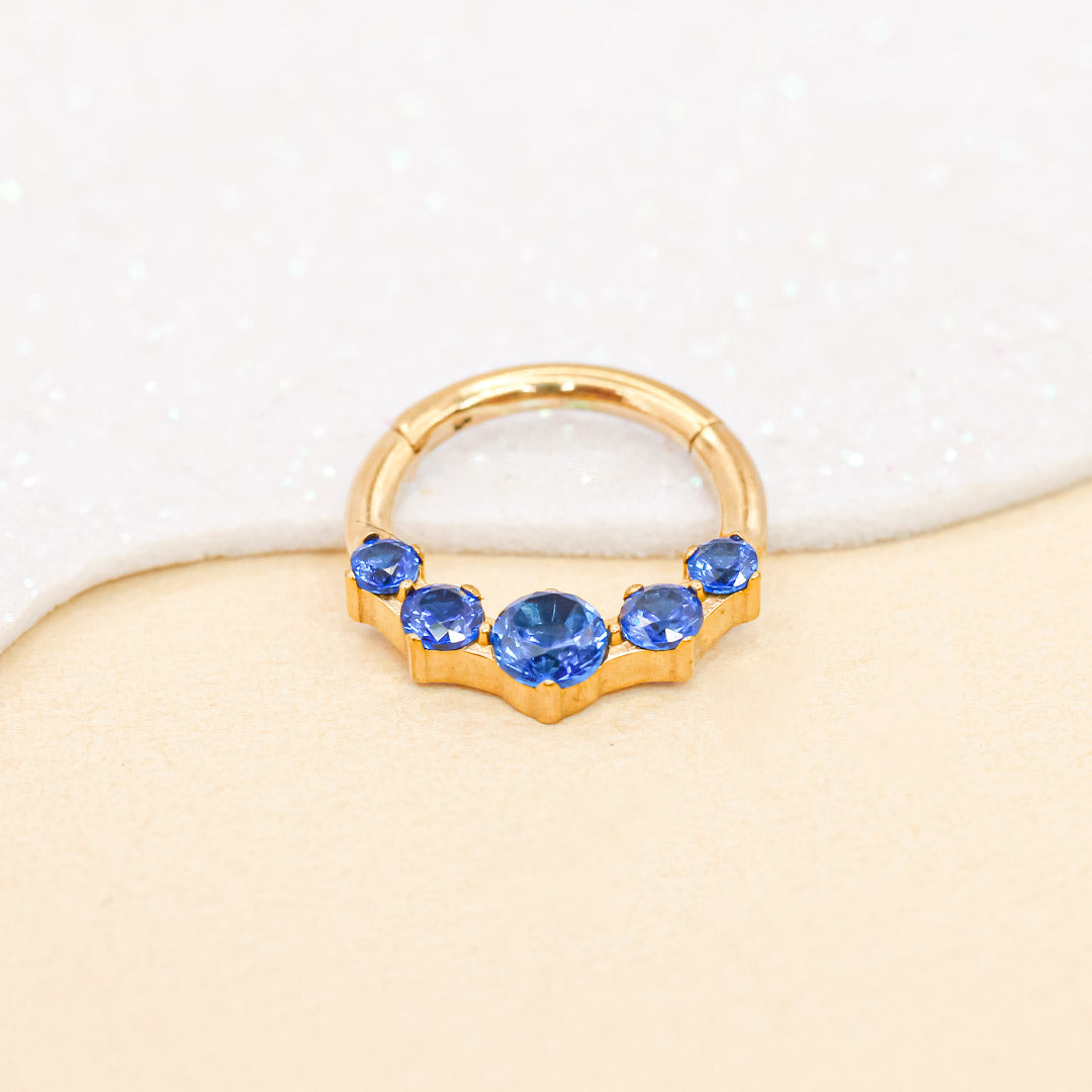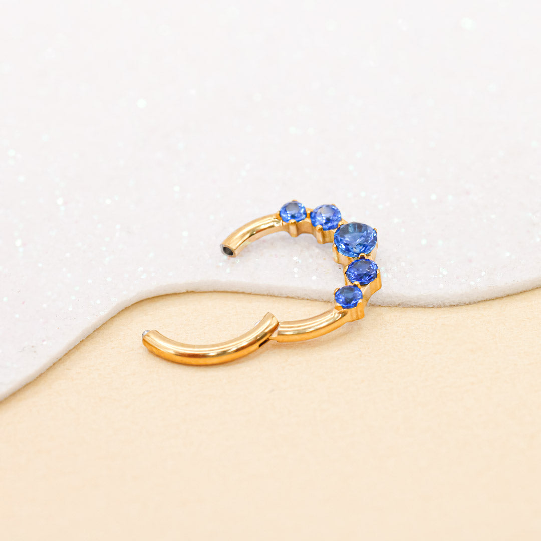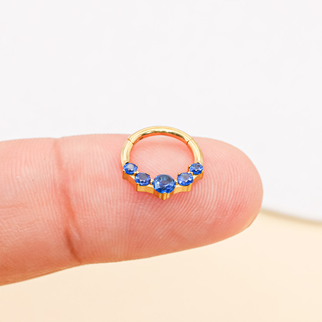 Amarás el tono azul zafiro y base dorada, este piercing combina elegancia y personalidad para destacar cualquier look, hecho de titanio grado implante.