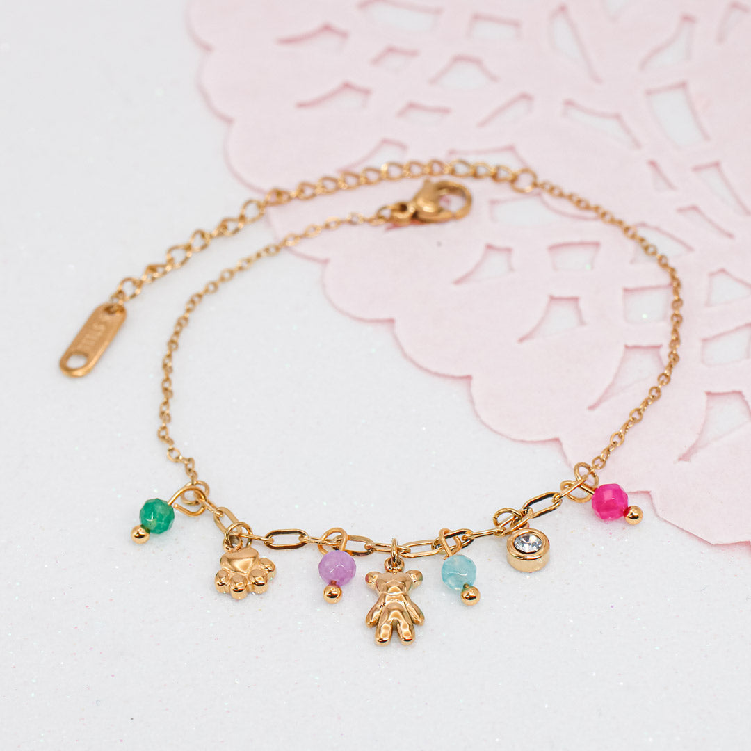 Los colgantes de esta pulsera te encantarán, tienen detalles de osito que la hacen lucir femenina y divertida.