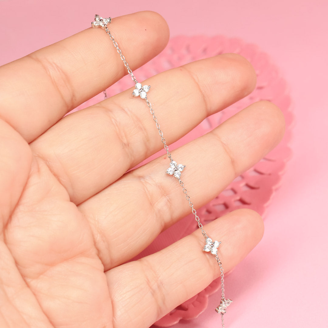 Agrega brillo a tu outfit con esta hermosa pulsera con florecitas, hecha de plata 925, hipoalergénica.